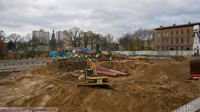 Trwa wywożenie ziemi z wykopu oraz układanie zbrojenia pod płytę fundamentową. Płot, który pojawił się wokół placu budowy jest zgodny z wymogami jakie postawił Wydziału Środowiska.